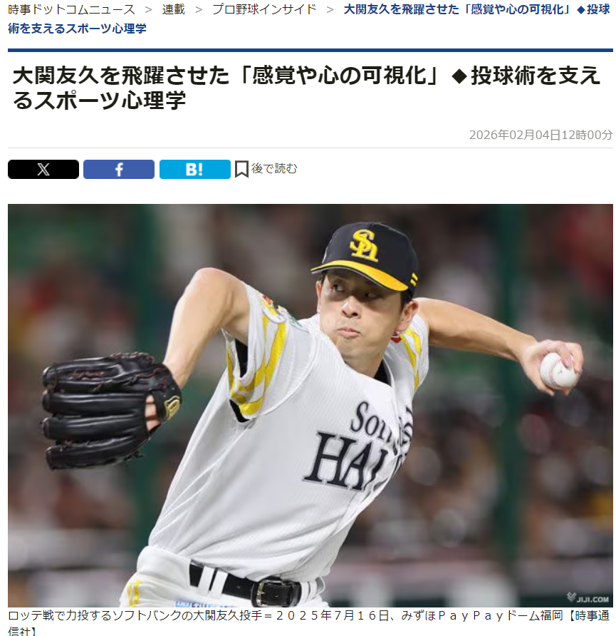 昨年ソフトバンク優勝に貢献した大関友久投手、実は出場した試合後のインタビューで、たくさんの印象深いコメントを発信していました。時事通信社様からの取材を受け、大関選手のコメントの「真意」をスポーツ心理学の視点から、布施が詳しく解説した内容がこちらの記事にまとめられています。大関選手の布施の1年間の取組みの中身が見えてくると思います。ぜひリンクからご覧ください。・言語化で生じる再現性・何にフォーカスす