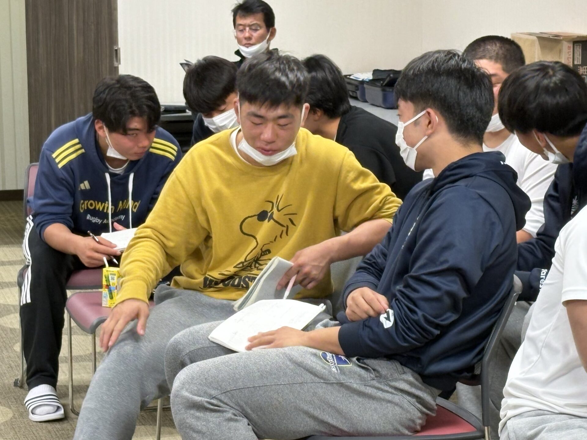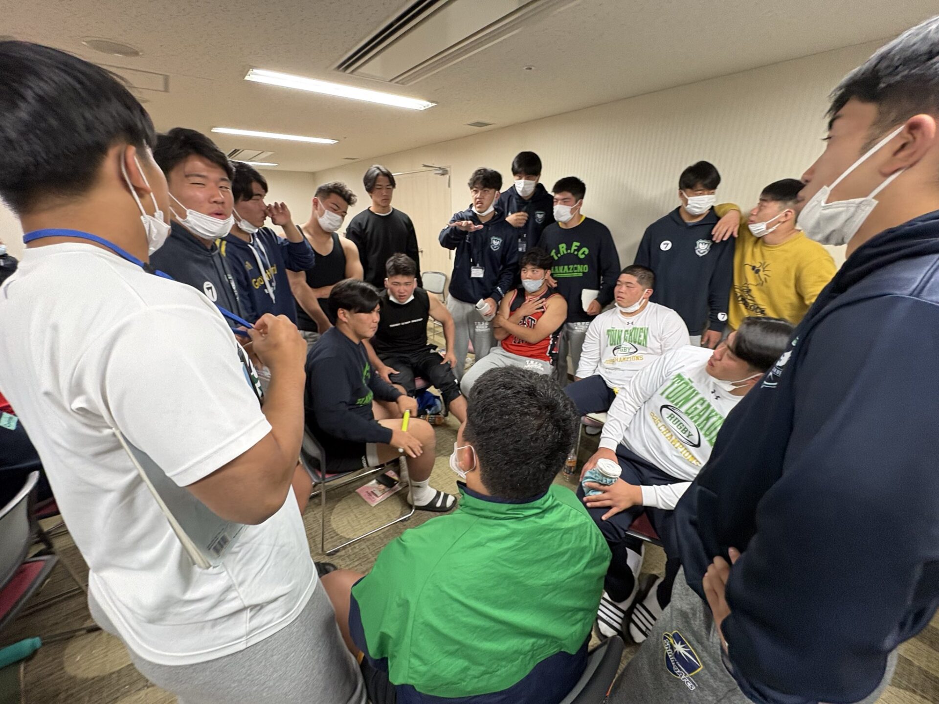 《1月2日準々決勝 (対 東海大大阪仰星) 前MTG》 ミーティングスタイル。毎年ミーティングのやり方は変わる。 前年チームと同じではダメだと気づいた選抜大会。自分達らしさを探したサニックス。夏合宿で毎日の試合に対応するスピード。手札が増え話すことが増加する秋。花園で今年はこうなったのかと毎年思う。